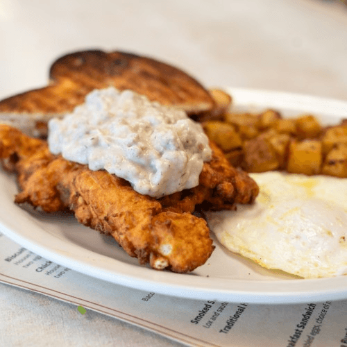 House breaded sirloin, house sausage gravy, home fries, two eggs your way and choice of toast