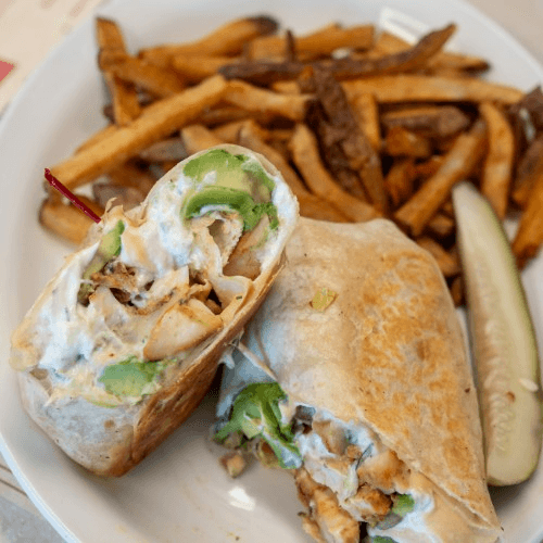 Grilled marinated chicken, hummus, avocado, tomato, cucumber, herbed yogurt sauce in a flour wrap