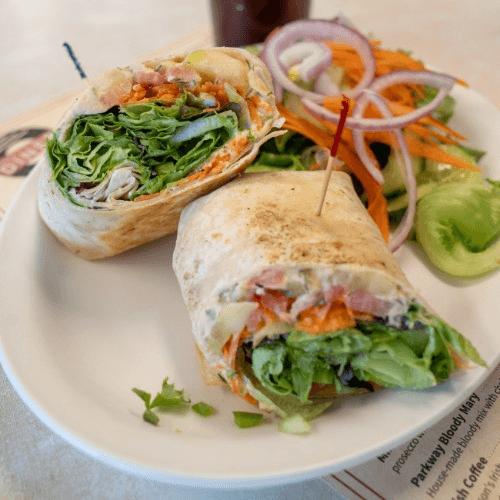 Scrambled eggs, veggie sausage, provolone cheese, roasted mushrooms, caramelized onions, spinach, tomato, avocado in a flour wrap
