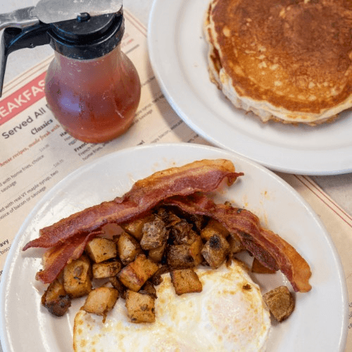 Buttermilk pancakes served with real VT maple syrup, two eggs, home fries, and choice of bacon or sausage