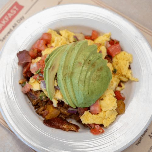 Scrambled eggs, home fries, crispy bacon, avocado, cheddar cheese, pico de gallo